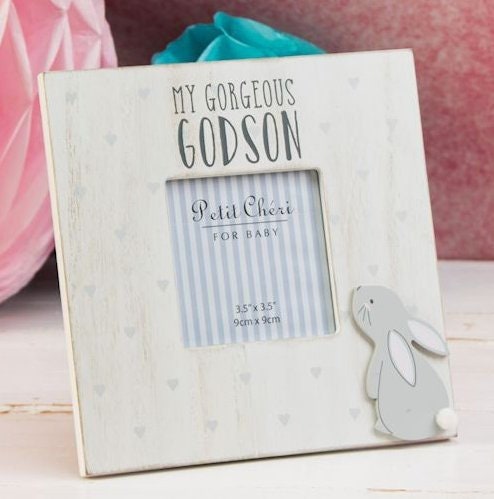 Featuring a white finish, 3D rabbit and 'Godson' wording, the frame itself holds a 3.5" x 3.5" (9 x 9cm) print and is supported by an easel style strut.