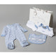 Description : 6 Piece net bag gift set including Bib, Body vest, Hat, Sleepsuit, Mittens and Gift Bag