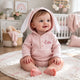 This cosy round-neck cardigan is adorned with sweet ballerina frills and lovely pearl grey buttons, personalised with charming hand-stitched embroidery. The cuffs are decorated with adorable little hearts for an extra touch of cuteness. A perfect snug layer for your little star!