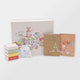 The outer cardboard box features a matt white finish, enhanced by gold detailing to both the outer box and inner lid. It contains four small, multicoloured matchbox-style boxes, notebook, drawstring pouch and envelope, all with further gold detailing.