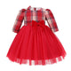 A playful, quirky Spanish Style dress, featuring a white layered petticoat, laced frill, and back bow applique, all complemented by coordinating frilly knickers - all in a bold red glitter corduroy fabric. Perfect for the Holiday season.