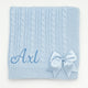 Keep your baby warm and cosy with this cream cable knit blanket. Crafted from soft acrylic, it features signature cable knit, satin bow, and an optional personalisation for added distinction. Perfect for snuggles and sweet dreams.