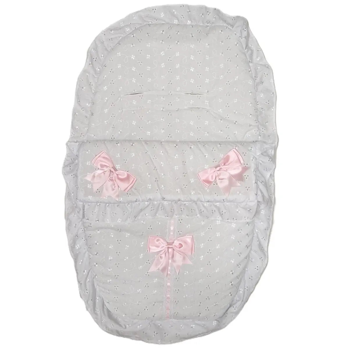 This white, padded car seat footmuff boasts frilly broderie Anglaise fabric embellished with elegant baby pink satin bows. Providing comfort and warmth, it is the ideal accessory for baby car seats and has a zip which easily reveals the inner liner.