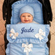 This Personalised Beige Pram Footmuff with Beige Bows is crafted from Polycotton and designed for year-round use with prams, strollers and buggies. Its decorative satin bow adds a stylish touch, while the padded construction ensures superior warmth and comfort. The footmuff can also be quickly converted into a pram or buggy liner.