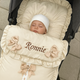 This Personalised Cream Pram Footmuff with Beige Bows is crafted from Polycotton and designed for year-round use with prams, strollers and buggies. Its decorative satin bow adds a stylish touch, while the padded construction ensures superior warmth and comfort. The footmuff can also be quickly converted into a pram or buggy liner.