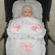 This pink polycotton footmuff with pink satin bows offers a comfortable and warm option for use on prams and buggies throughout the year. It can be easily converted into a pram, stroller or buggy liner, providing extra padding for added comfort.