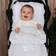 Our personalised pink footmuff with white satin bows is a must-have accessory for all prams and buggies. It offers year-round protection, adapting quickly to a pram, stroller or buggy liner. Additionally, its padding provides extra comfort and warmth.