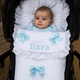 This Polycotton Footmuff with Lilac satin bows provides the perfect accompaniment to prams and buggies. Versatile and practical, it also serves as a protective liner for strollers in all seasons. Offering optimal warmth and comfort due to its soft padding, you can travel in ultimate coziness.