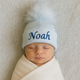 This Personalised Grey Baby Hat will make a great baby gift or baby shower present. Featuring a soft fabric in white and blue, with fluffy pom poms, this hat can be personalised with baby's name for an extra special touch. Keep your little one cosy and stylish.