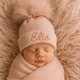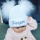 This Personalised pink Baby Hat will make a great baby gift or baby shower present. Featuring a soft fabric in white and pink, with fluffy pom poms, this hat can be personalised with baby's name for an extra special touch. Keep your little one cosy and stylish.