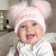 This super soft knit rose gold hat with faux fur pom poms is the perfect addition to any baby or child's winter wardrobe. Personalise it with an embroidered name for an extra special touch.