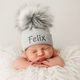 A beautiful and special gift for that special baby girl in your life, this personalised rose gold baby hat with fluffy pom poms is perfect for a gender reveal party or a baby shower. The knitted hat can be personalised, making it an extra special present.