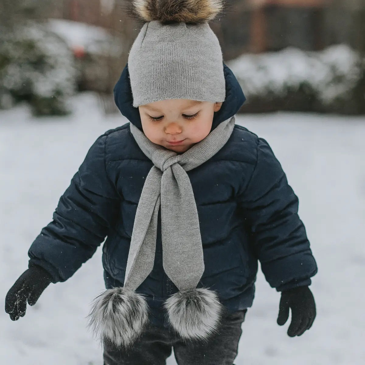 Keep your little ones snug with our charming knitted scarf adorned with soft faux fur pom poms in a delightful grey shade. Sized just right for babies and toddlers to stay warm and look adorable!
