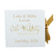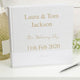 This Traditional Guest Book and Pen is the ideal way to remember special moments from your Wedding Day.This guest book can be personalised with up to 3 lines of text, with a maximum of 25 characters per line.Line 1 is fixed UPERCASE.On lines 2 & 3 please avoid using capital letters as this may make the personalisation is hard to heard to read.Please note 'Love, Laughter and happily ever after' and 'Guest Book' is fixed text and cannot be changed.There are approximately 30 sheets of high quality paper inside and the pen is a ball point.The cover has a soft linen texture.Ideal for any Weddings.
