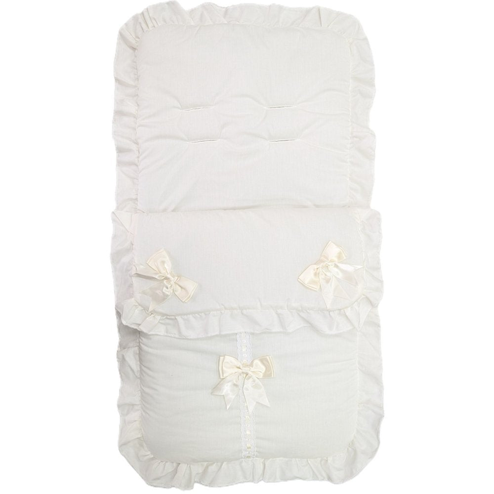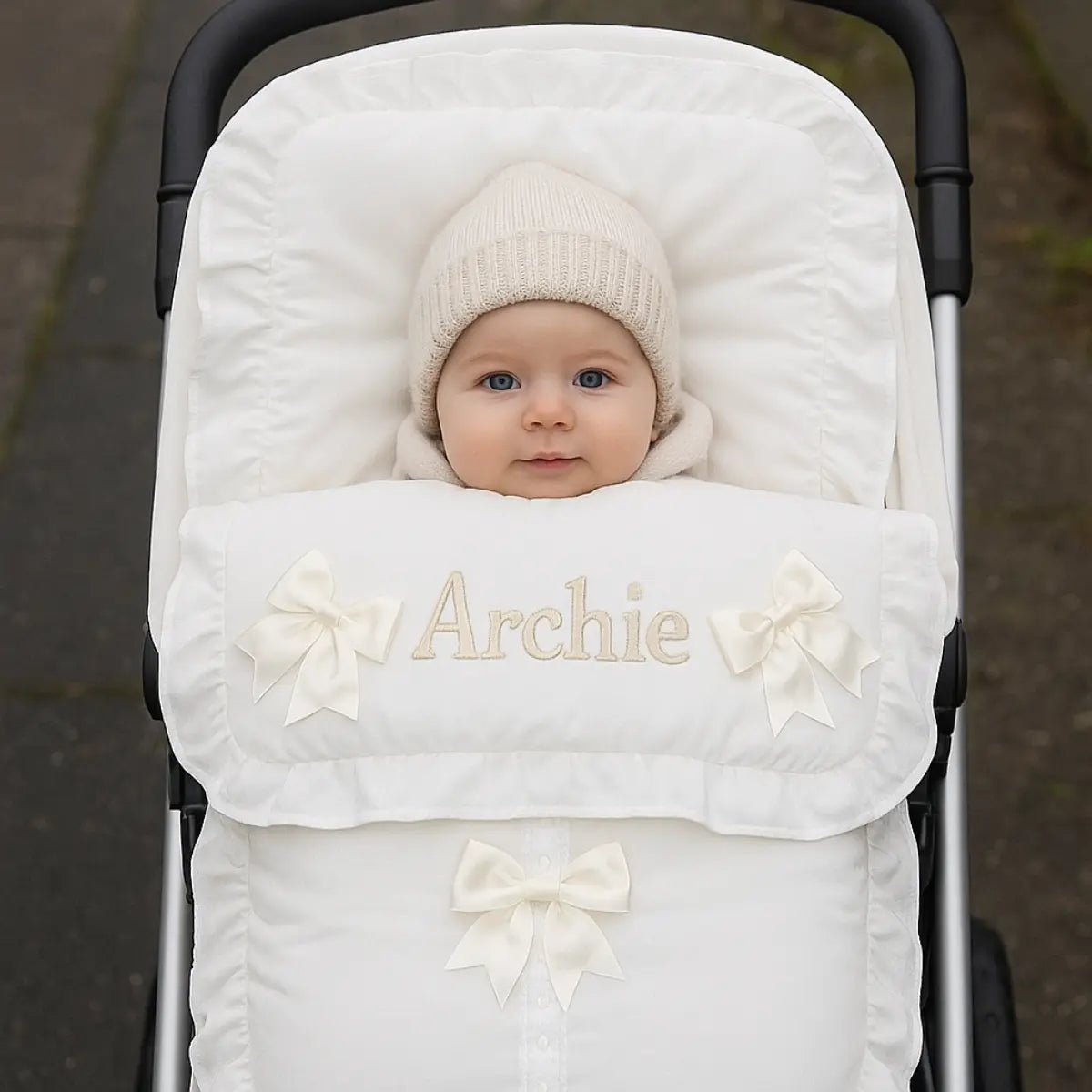 This Personalised Cream Pram Footmuff with Cream Bows is crafted from Polycotton and designed for year-round use with prams, strollers and buggies. Its decorative satin bow adds a stylish touch, while the padded construction ensures superior warmth and comfort. The footmuff can also be quickly converted into a pram or buggy liner.