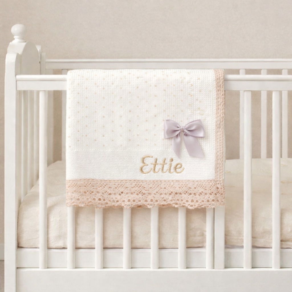 Wrap your little one in warmth and comfort with this Ivory open dot baby shawl, featuring delicate beige lace trim and a charming beige satin bow. Made from soft acrylic, it’s ideal for cuddles and peaceful naps.