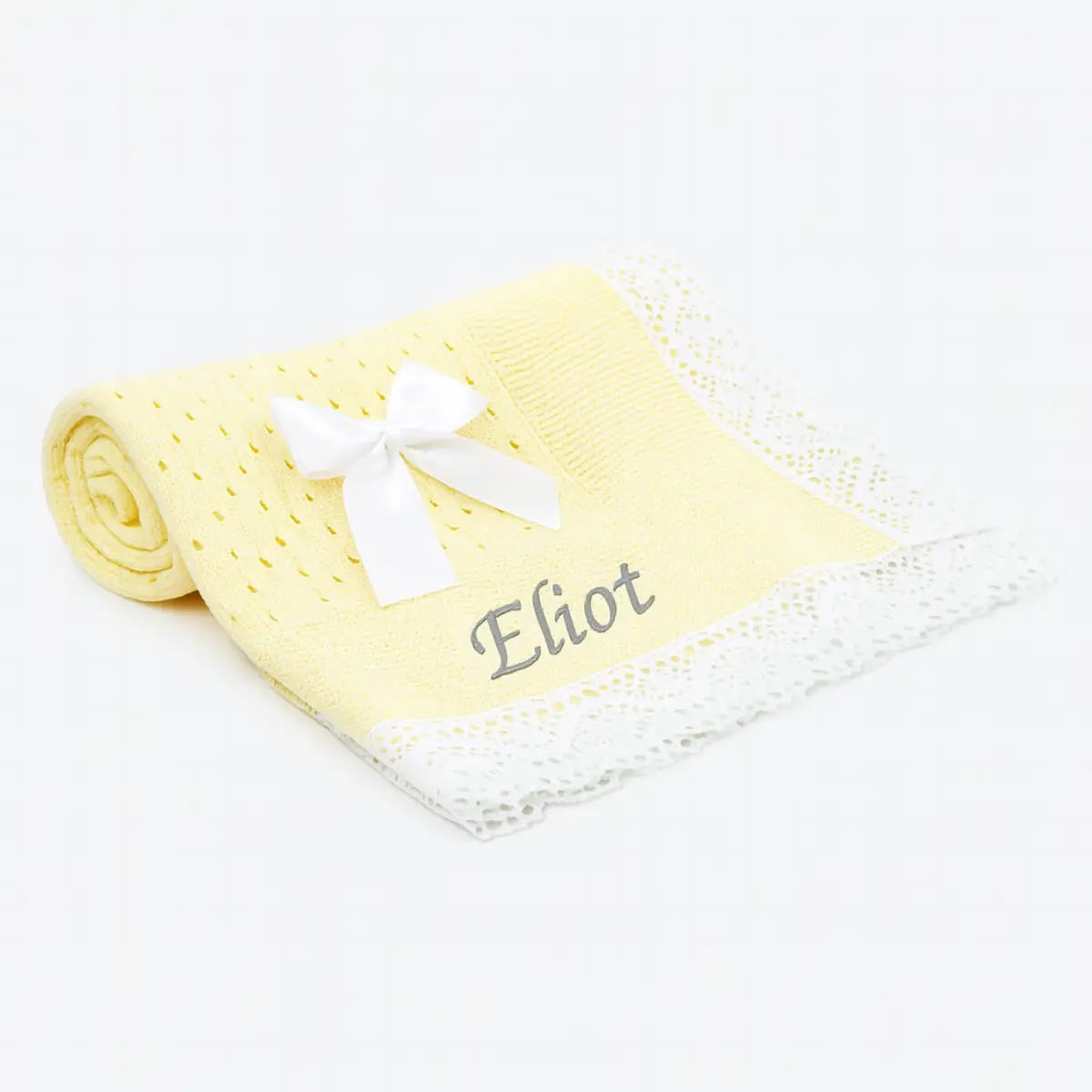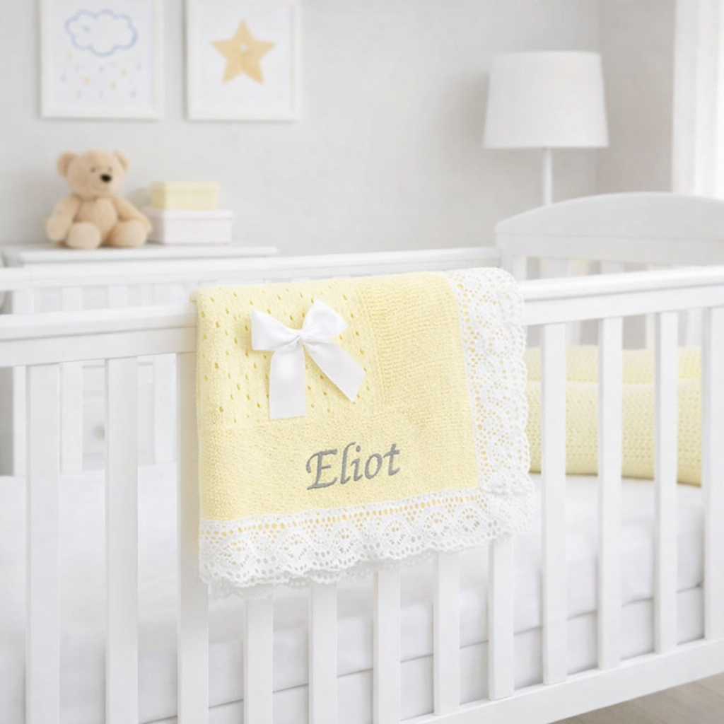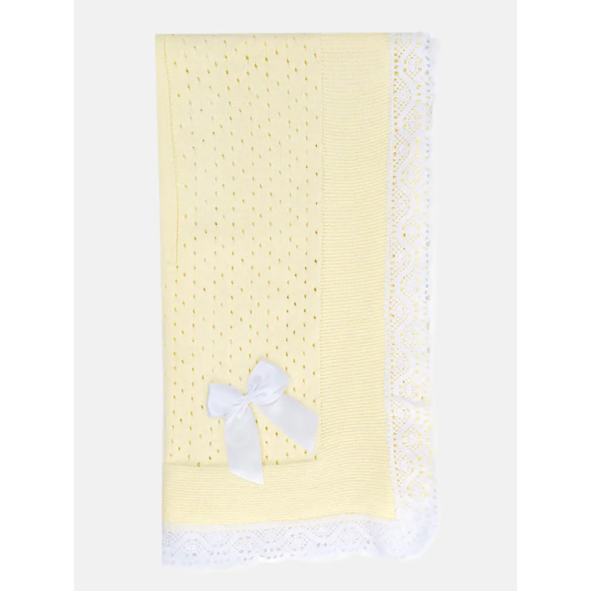Wrap your little one in warmth and comfort with this Lemon open dot baby shawl, featuring delicate White lace trim and a charming beige satin bow. Made from soft acrylic, it’s ideal for cuddles and peaceful naps.