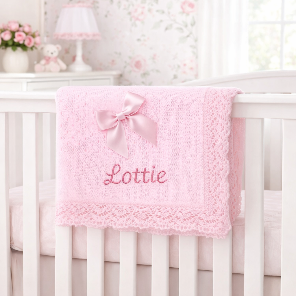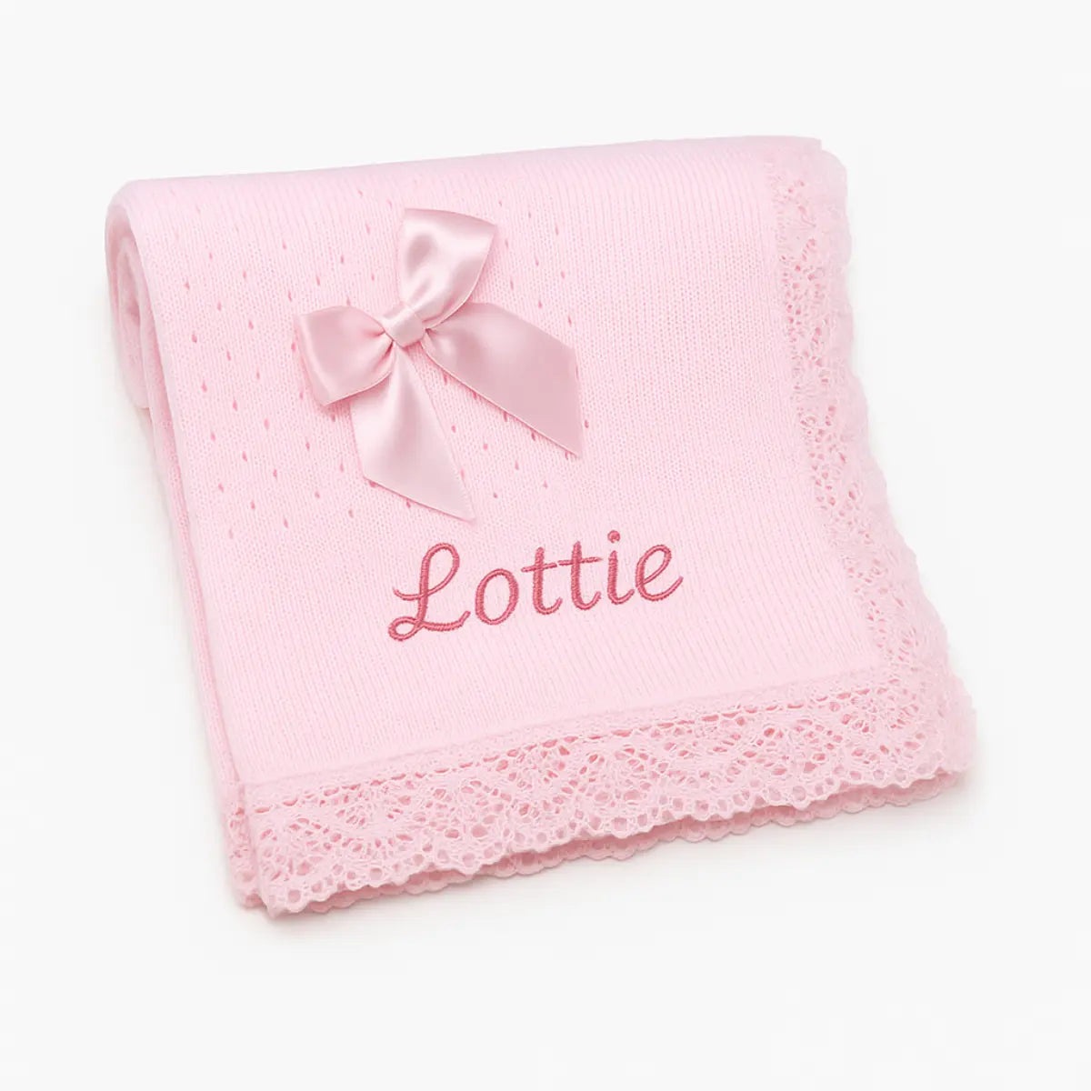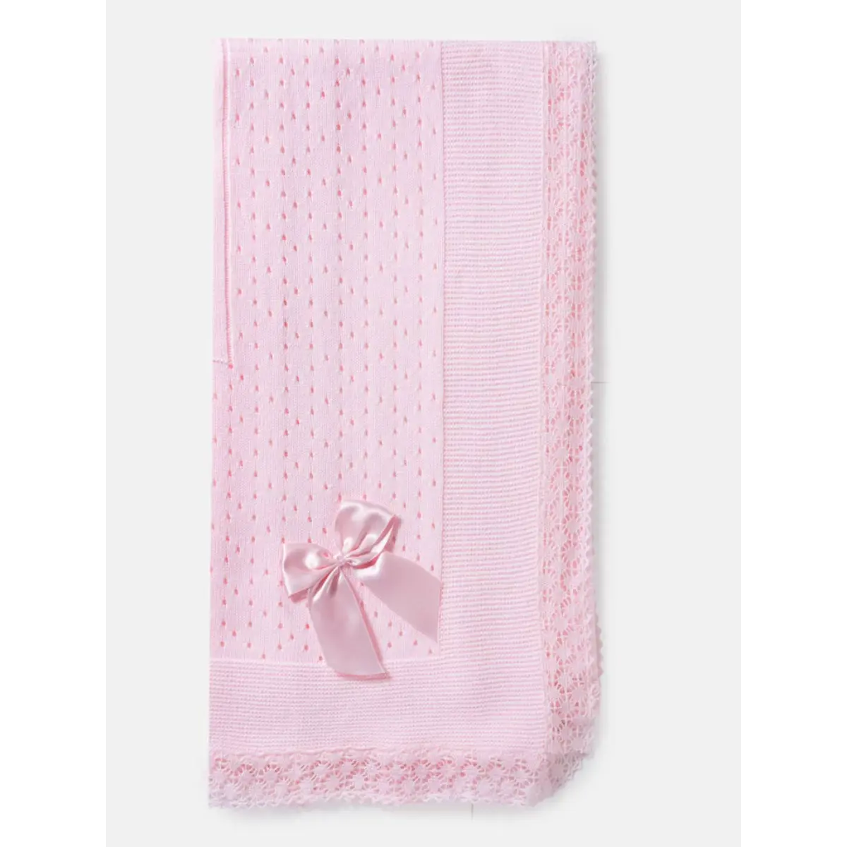 Wrap your little one in warmth and comfort with this pink open dot baby shawl, featuring delicate Lace trim and a charming beige satin bow. Made from soft acrylic, it’s ideal for cuddles and peaceful naps.