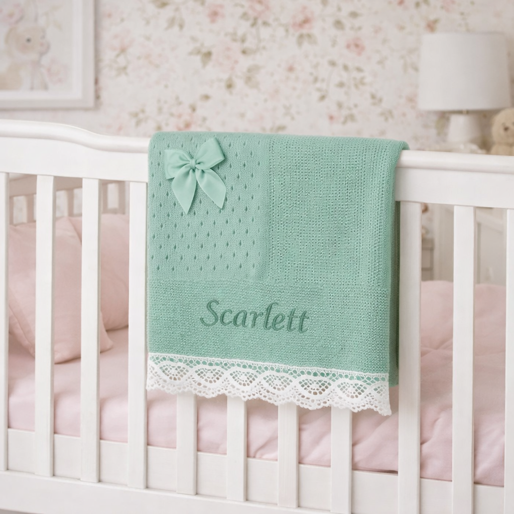 Wrap your little one in warmth and comfort with this Sage Green open dot baby shawl, featuring delicate White lace trim and a charming beige satin bow. Made from soft acrylic, it’s ideal for cuddles and peaceful naps.