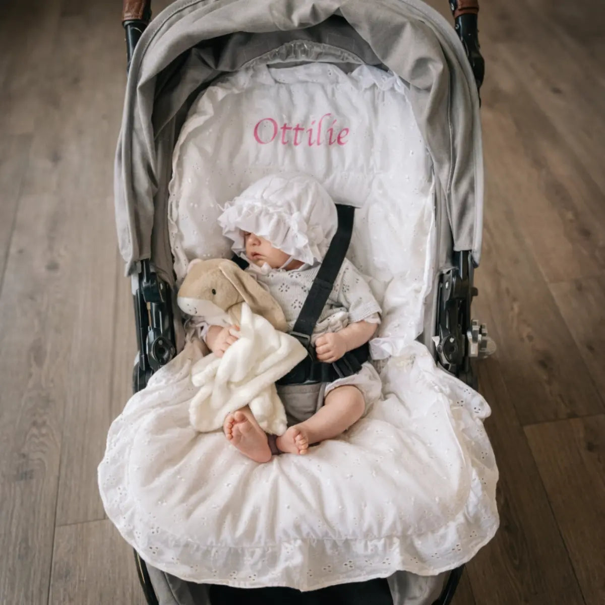 Bring a touch of glamour to your baby's pram or buggy with these personalised white frilly pram liners. Boasting frilled edges and a comfy padding, they provide a stylish and comfortable ride. Crafted from broderie anglaise fabric, this liner helps to keep your baby cool in the summertime.