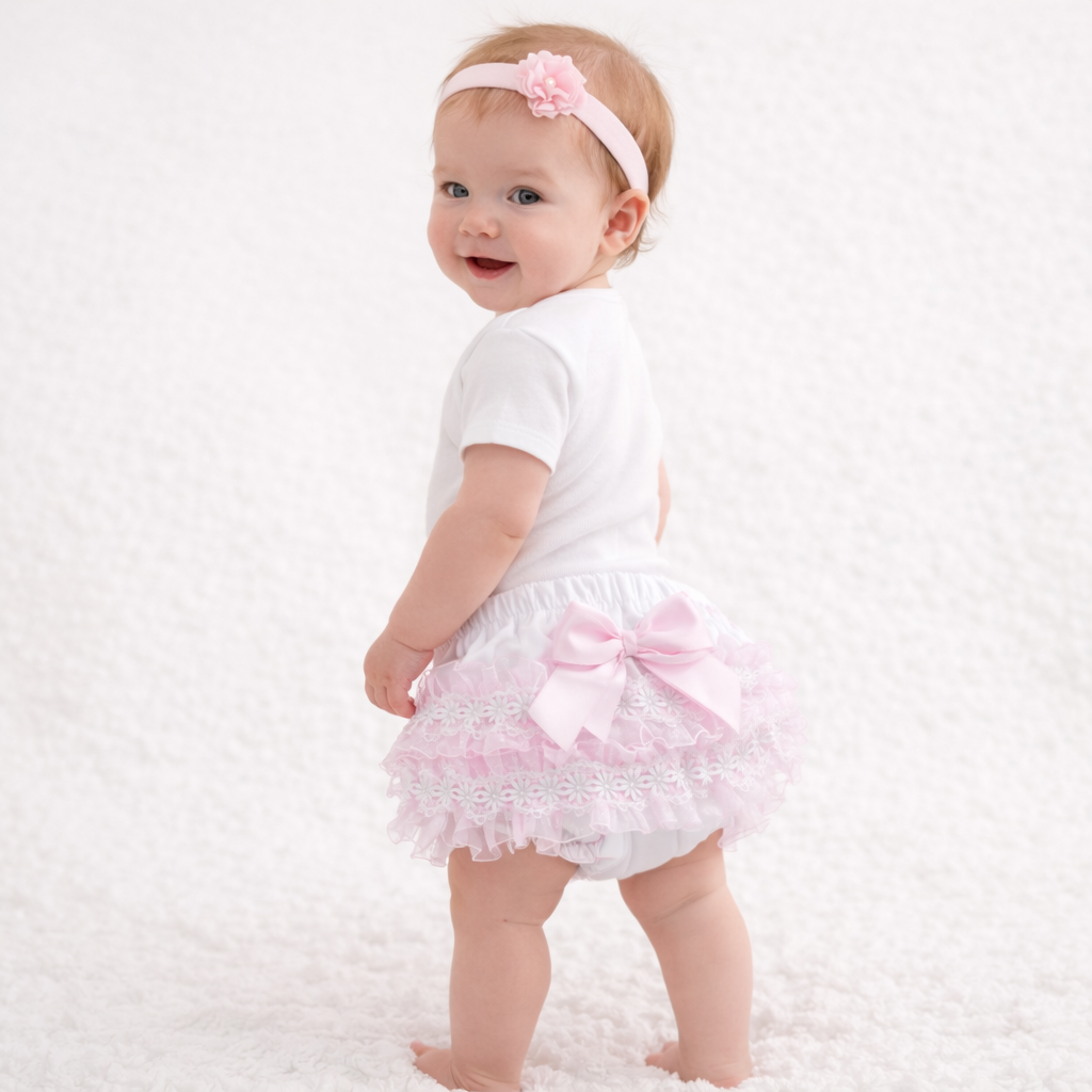 Get your little princess ready for summer with these cute and stylish white and pink frilly pants. Perfect to wear with summer dresses, these pants will keep your baby girl comfortable and looking great.